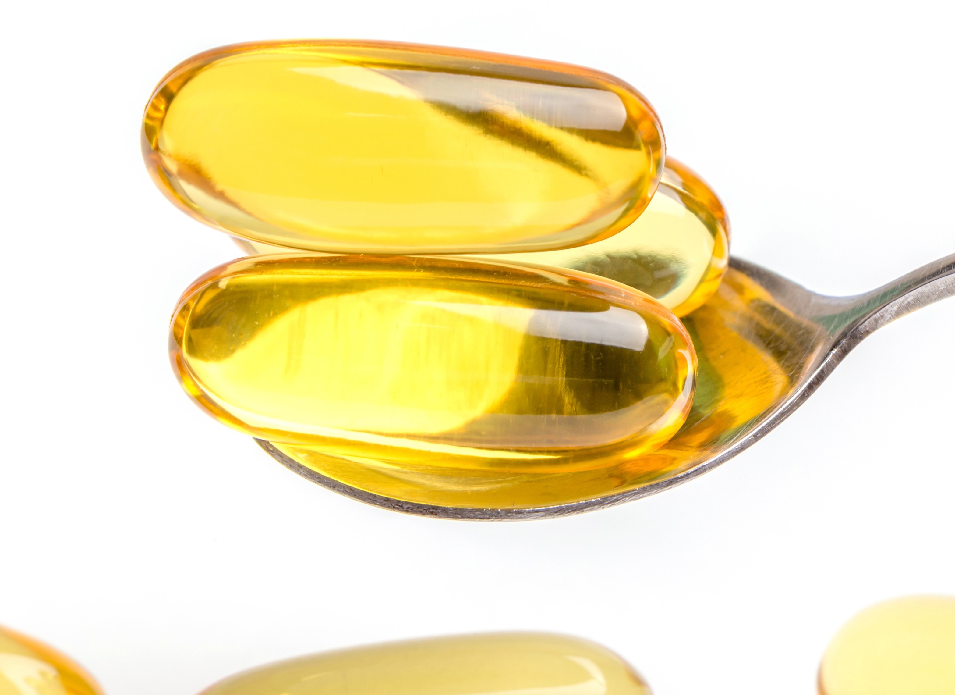 Golden soft gel capsules served by spoon and blurred another capsules in background optimal oil supplement intake concept.