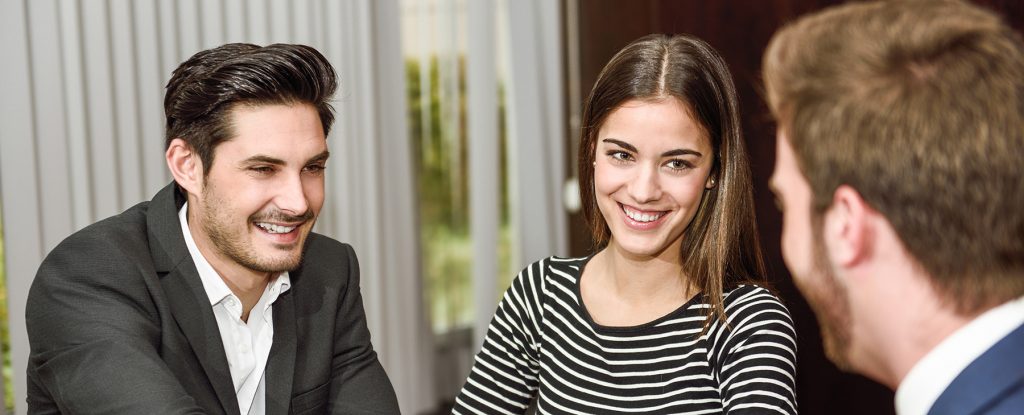 Smiling young couple shaking hands with an insurance agent or investment adviser